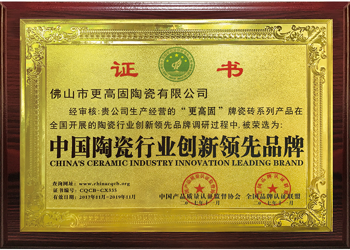中國(guó)陶瓷行業(yè)創(chuàng)新領(lǐng)先品牌金色證書(shū)